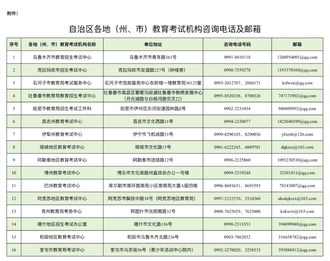 附:自治区各地(州、市)教育考试机构咨询电话及邮箱