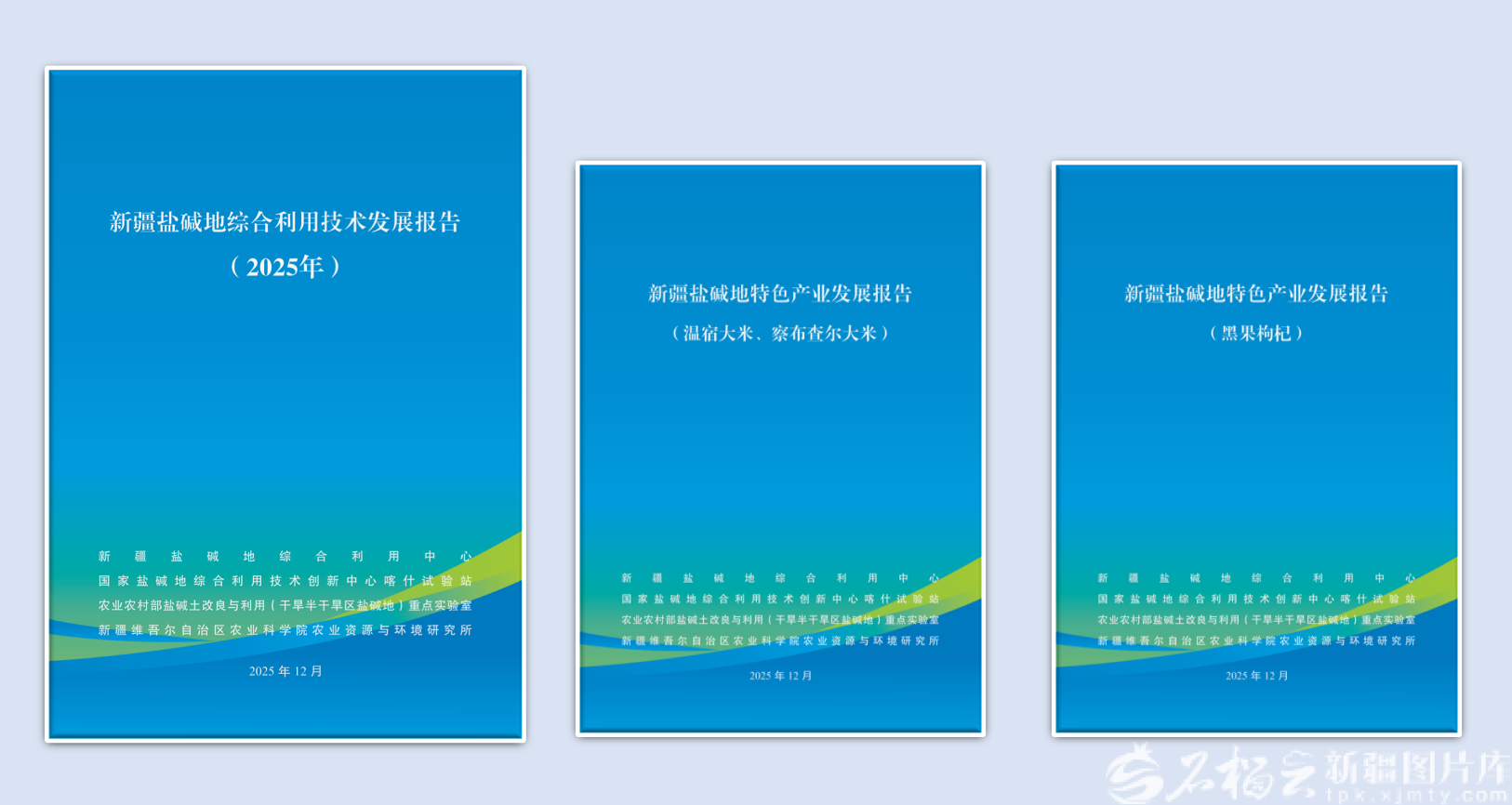 图为日前发布的《新疆盐碱地综合利用技术发展报告》及两份副报告。