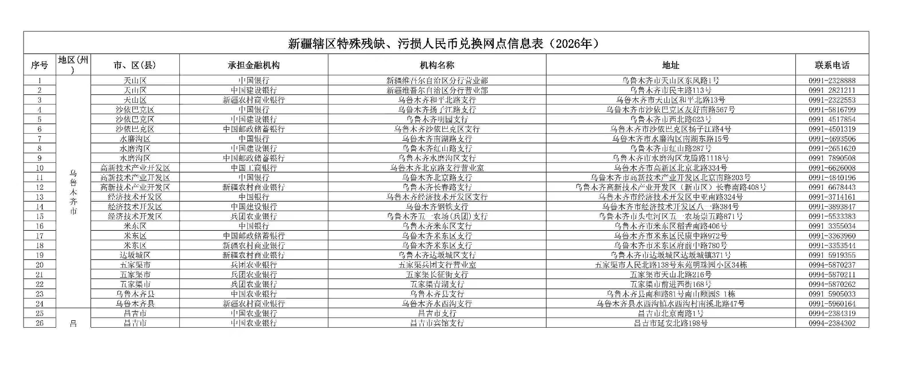 天山网-新疆日报讯(记者 王永飞 报道)记者从中国人民银行新疆分行获悉:为进一步便利社会公众办理特殊、残缺污损人民币兑换业务,持续优化现金服务,近日,人民银行新疆分行按照合理布局、有效覆盖、便利群众的原则,对新疆辖区特殊残缺、污损人民币兑换网点予以动态调整。