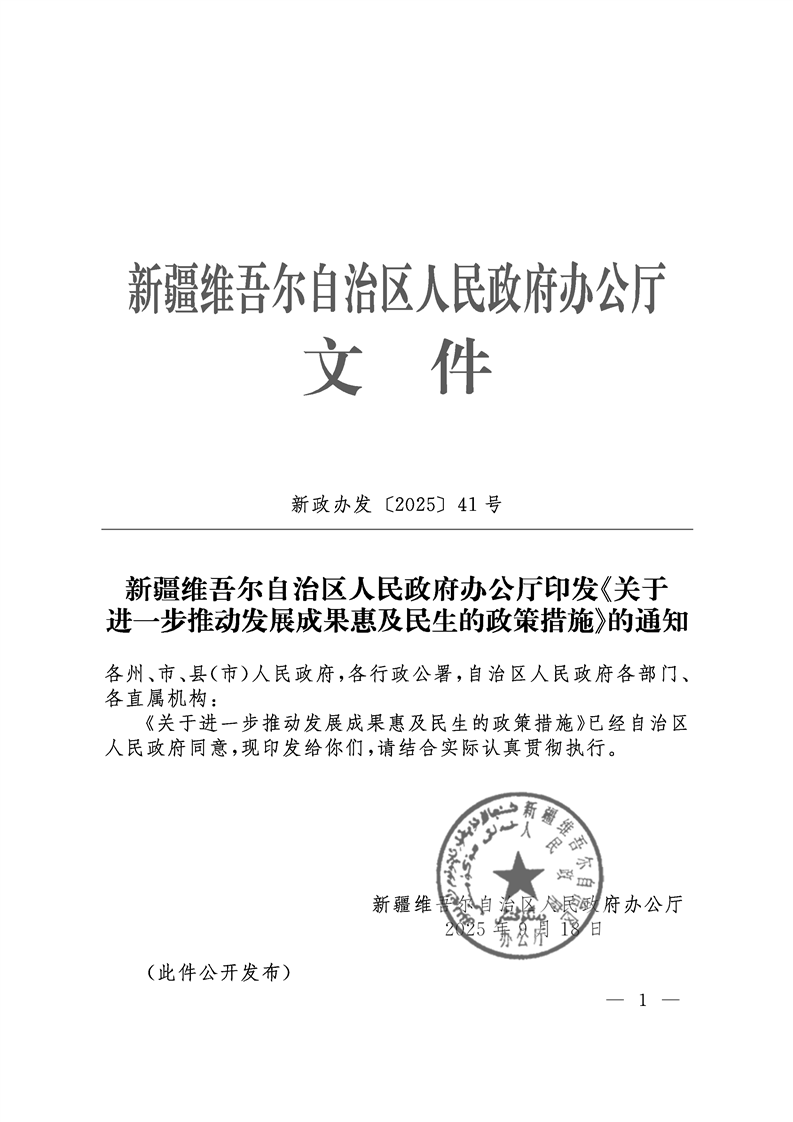 新疆维吾尔自治区人民政府办公厅印发《关于进一步推动发展成果惠及民生的政策措施》的通知