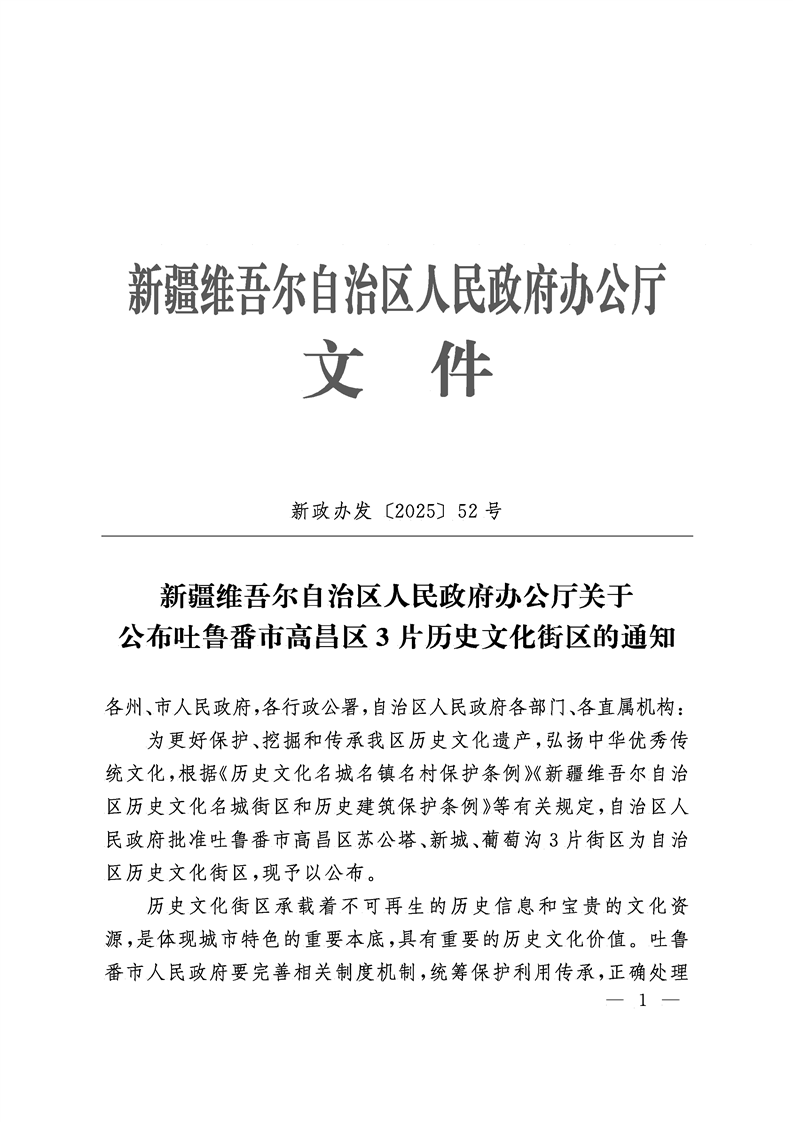 新疆维吾尔自治区人民政府办公厅关于公布吐鲁番市高昌区3片历史文化街区的通知