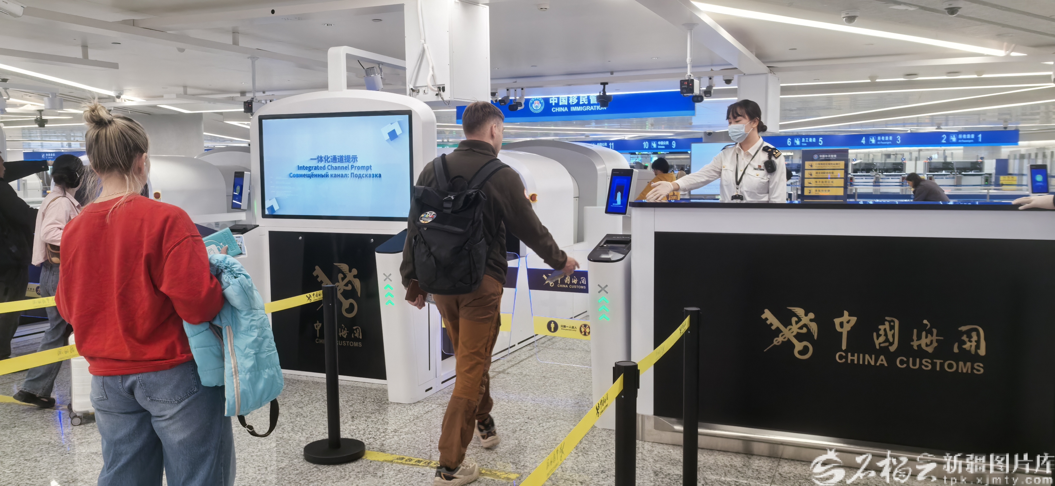 10月8日,乌鲁木齐天山机场海关关员引导入境旅客有序通过通道。罗芸 摄