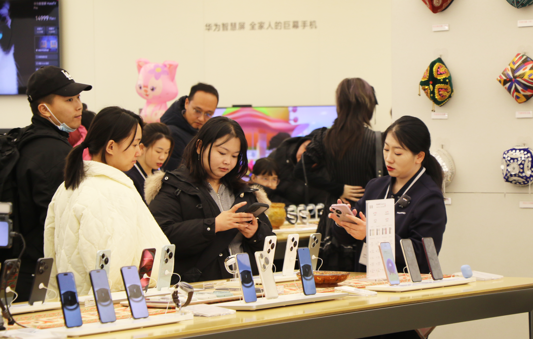 在喀什东城万达广场某品牌店,不少消费者驻足挑选数码产品。喀什地区融媒体中心记者 石观 摄