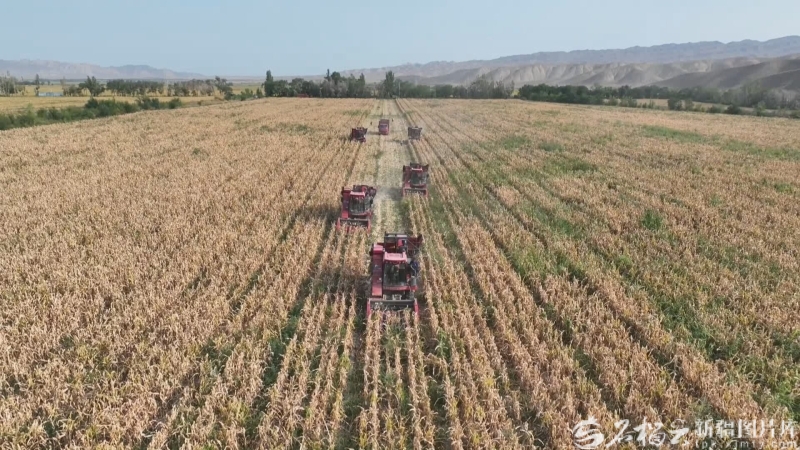 9月底,玛纳斯县包家店镇的制种玉米地里,农机来回穿梭收割玉米,一派丰收的繁忙景象。玛纳斯县融媒体中心供图