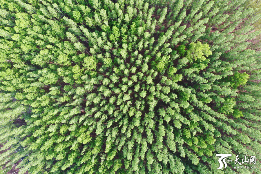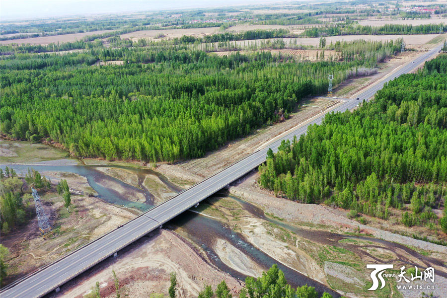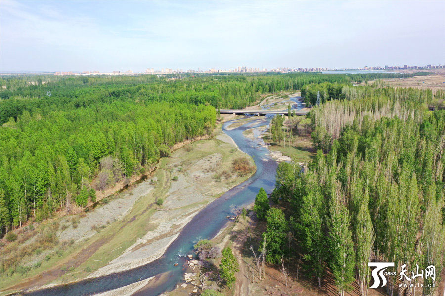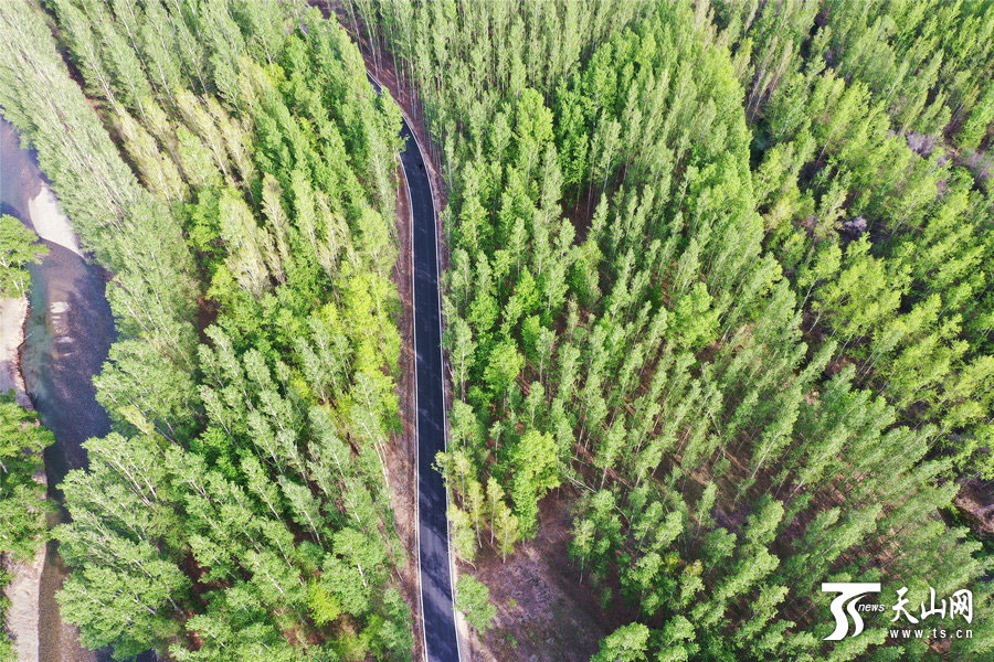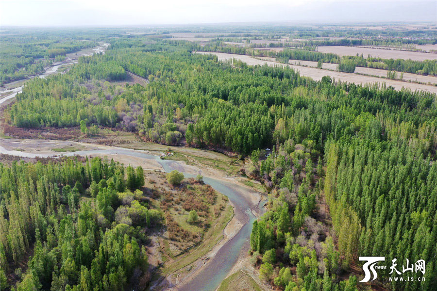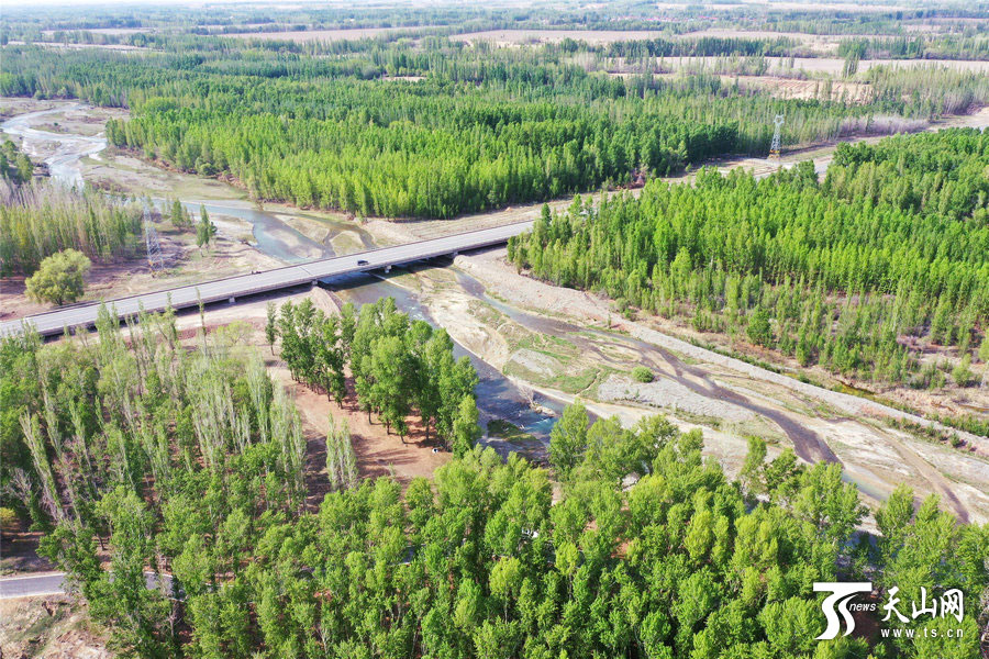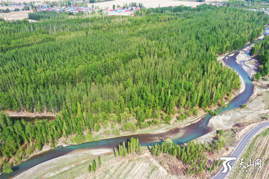 天山网讯(通讯员胡维斌摄影报道)博尔塔拉蒙古自治州境内的博尔塔拉河谷(4月27日无人机拍摄)。四月的博尔塔拉河谷,清澈的河水由西向东蜿蜒而来,滋润着两岸树木,生机无限,呈现出春色满谷的景象。