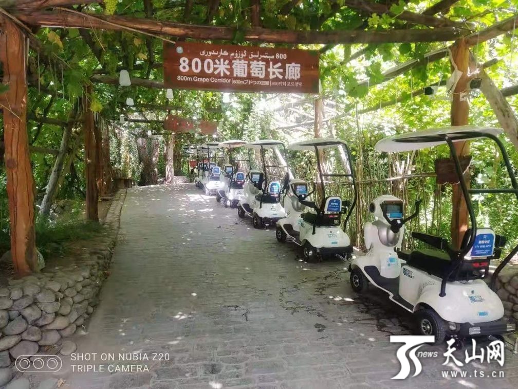 2021年7月1日起,葡萄沟景区引进“伴游机器人”,每台可乘坐3人,能提供协助规划旅游线路、沿线基础设施导航、景点语音互动介绍等服务。“伴游机器人”是半自动驾驶,设置有陡坡缓降、主动避让、智能刹车等系统。除此之外,该景区还在游客必经的葡萄沟游乐园、800米葡萄长廊等处增设了雾化降温系统。抽取葡萄沟的清凉泉水经过滤软化后,通过喷雾系统间歇性喷雾。水雾瞬间蒸发,使得周边环境温度维持在30℃左右,让游客在游览过程中体感始终较为舒适。
