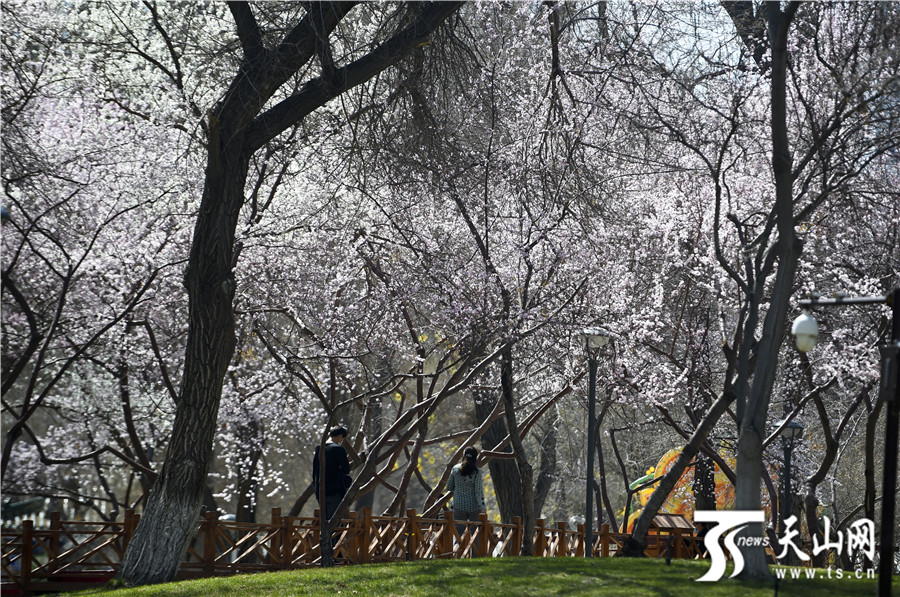 4月7日,市民在乌鲁木齐市人民公园踏青赏花。随着气温回升,人民公园里的山桃花次第绽放,很多市民走进公园,乐享春日。记者汤永摄