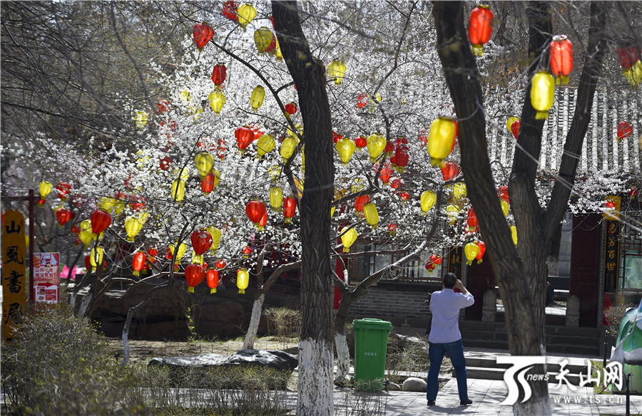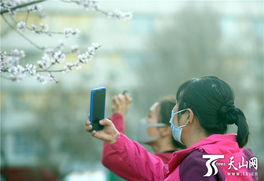 4月6日,市民在乌鲁木齐市人民广场拍摄桃花。记者秦梅花摄