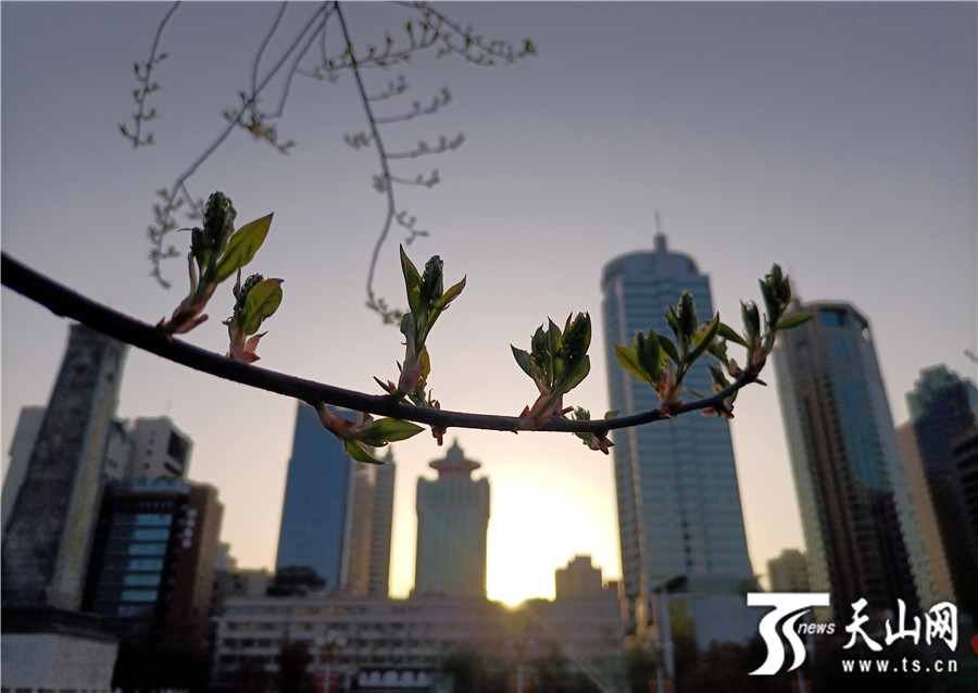 4月6日,乌鲁木齐市人民广场上柳树冒出了新芽。记者秦梅花摄