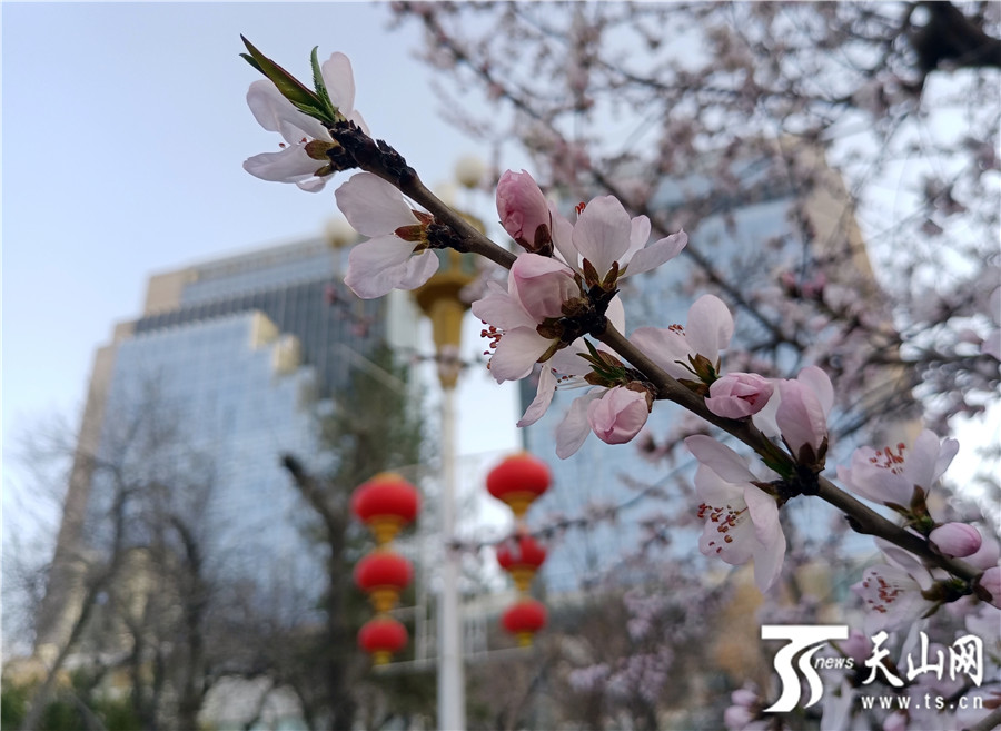 4月6日,乌鲁木齐市人民广场绽放的桃花。记者秦梅花摄