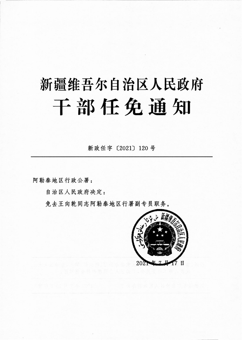 关于王向乾同志职务的任免通知