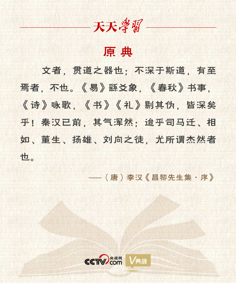 在中国古代文学批评史上,“文”与“道”的关系问题,一直是历代文论家阐释的重要命题。唐代古文运动领袖韩愈为了反对六朝以来的绮靡文风,提出“修其辞以明其道”。他的门生李汉在为《昌黎先生集》所作的序中开宗明义地写道:“文者,贯道之器也。”意思是文章是贯通“道”的工具,强调做文章要解决现实社会问题。上述观点实际上反映了韩愈的文学思想。在“文以贯道”基础上,北宋理学家周敦颐进一步提出了“文以载道”的主张。